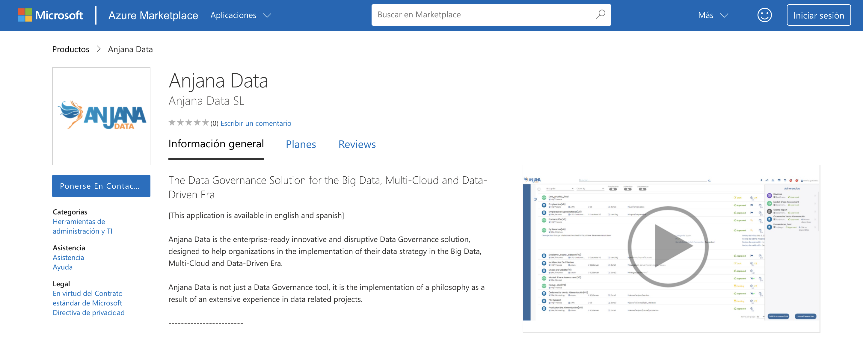 Desde Anjana Data tenemos el placer de comunicar que seguimos creciendo y cumpliendo todas las expectativas que teníamos previstas. Hace más de un año firmamos un acuerdo de colaboración con Microsoft, y después de mucho esfuerzo tenemos el placer de comunicar que nuestra solución para el Gobierno del Dato, diseñada para ayudar a las organizaciones en la implementación de su estrategia de datos en la era Big Data, Multi-Cloud y Data-Driven ya está disponible en el Marketplace de Azure y en App Source de Microsoft.