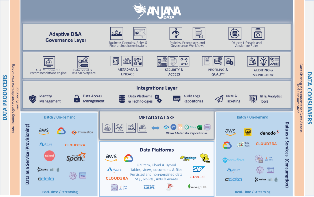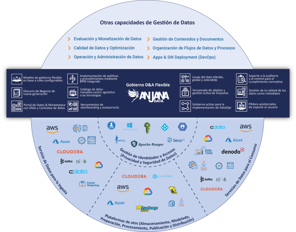 Diseñada para integrarse en cualquier ecosistema tecnológico, Anjana Data Platform presenta una arquitectura abierta, flexible, escalable e interoperable con integración nativa extendida bidireccional, sobre multitud de tecnologías de gestión de datos & IA, incluyendo los servicios nativos de los principales proveedores de Cloud.