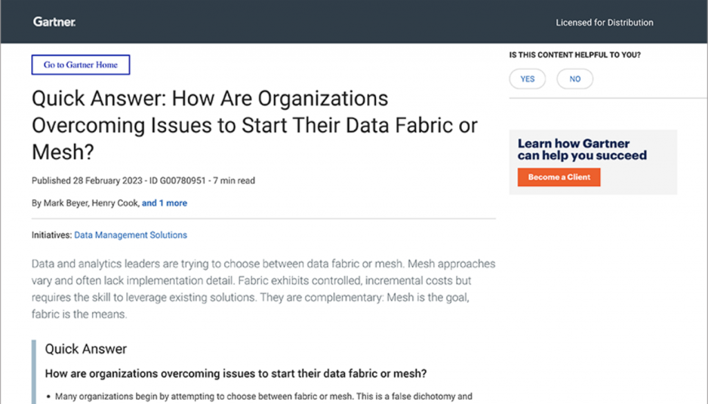 Desde Anjana Data teníamos muchas ganas de presentaros el documento ‘Quick Answer: How Are Organizations Overcoming Issues to Start Their Data Fabric or Mesh?’ de Gartner, ya que recoge dos de los temas más candentes actualmente entre las comunidades de expertos en Gestión de Datos y de los cuales además han hablado últimamente varios de […]