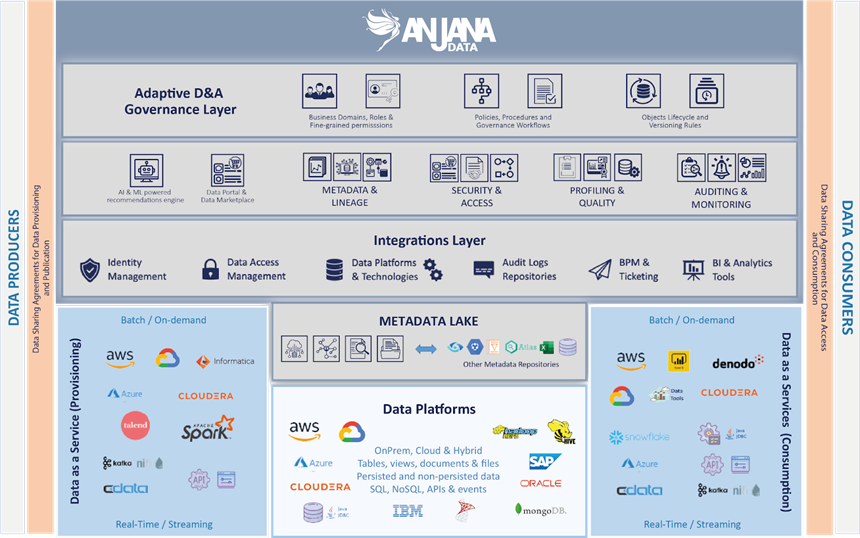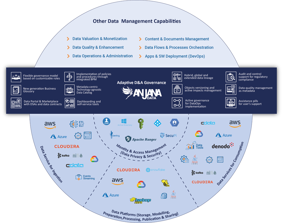 Por poner un ejemplo llevado al extremo, podríamos estar considerando una arquitectura híbrida multi-cloud con piezas nativas de AWS, Azure y GCP, DWH tradicionales con Oracle, SQL Server o Teradata, un Datalake on-premise con Cloudera, una Plataforma Big Data en Cloud con Snowflake o Databricks, una capa de virtualización con Denodo y todo ello gobernado por Anjana Data Platform con las integraciones nativas correspondientes para cubrir las capacidades deseadas.